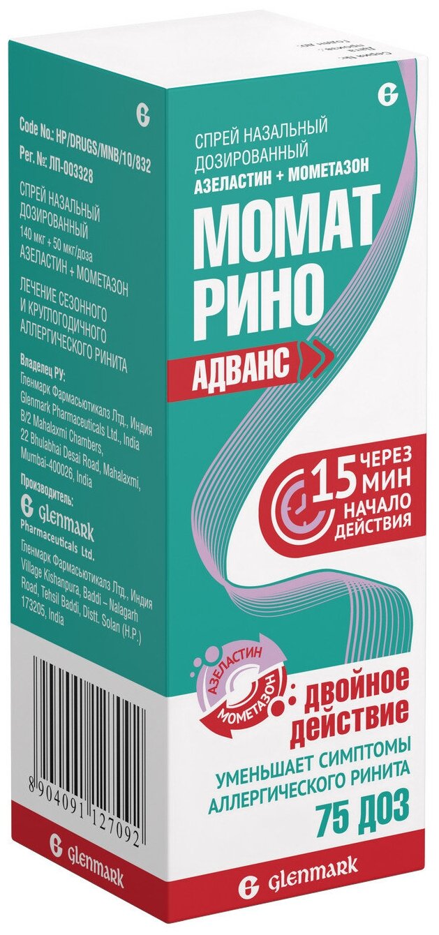 Лекарства для лечения аллергии Гленмарк Фармасьютикалз Момат Рино Адванс спрей назал 140мкг+50 мкг/доза 75 доз