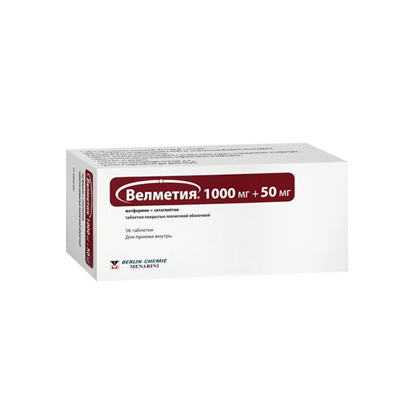 Велметия, таблетки, покрытые пленочной оболочкой 1000 мг + 50 мг, 56 шт.