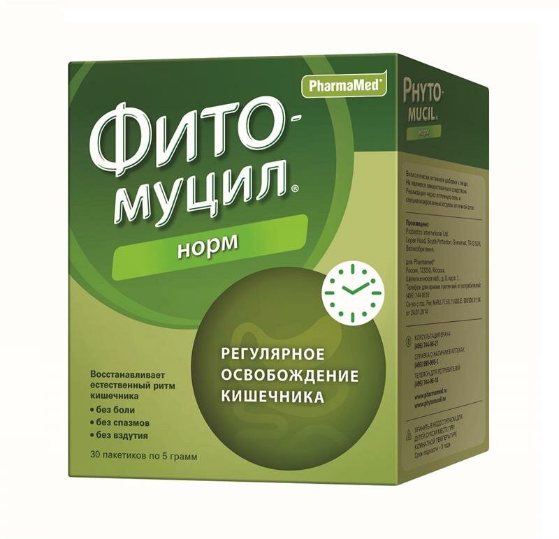 | Фармакологическое действие | Растворимые волокна Фитомуцила в кишечнике впитывают воду, разбухают, превращаются в слизистый гель и размягчают стул, что способствует его легкому выведению. Нерастворимые пищевые волокна механически стимулируют стенки кишечника, активизируя его движения и выведение отходов. Таким образом, Фитомуцил одновременно воздействует и на содержимое кишечника, и на его слизистую оболочку, избавляя от запоров, вздутия и ощущения тяжести. Кроме слабительного эффекта, Фитомуцил создает благоприятные условия для роста собственной полезной кишечной микрофлоры, что способствует устранению дисбактериоза, который всегда имеет место при запорах. |