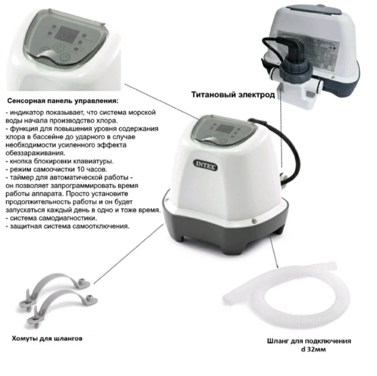 | Комплектация | Хлорогенератор, шланг 102 см 32мм, зажим для шланга 2 шт. |