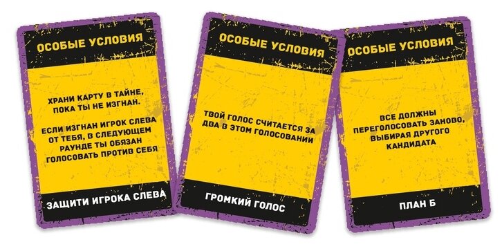 | Комплектация | Профессии - 50 карт; Факты - 50 карт; Биология - 30 карт; Особые условия - 30 карт; Здоровье - 30 карт; Хобби - 30 карт; Бункер - 30 карт; Багаж - 30 карт; Катастрофы - 20 карт; Угрозы - 11 карт; Бланки голосования - 120 шт |
