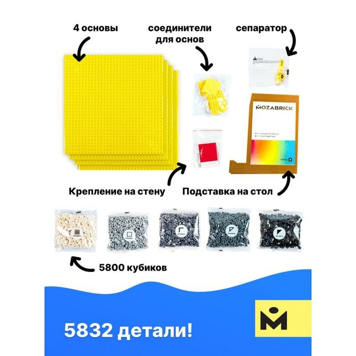 | Дополнительная информация | состав набора: подставка, руководство по сборке с кодом, 4 поля 32x32, 9 крепежных пластин 6х6, 5 цветов по 1160 кирпичиков, демонтажный ключ, кирпичик с логотипом Mozabrick, 10 стикеров двустороннего скотча 3М для крепления картины к стене; время сборки: 12 часов |