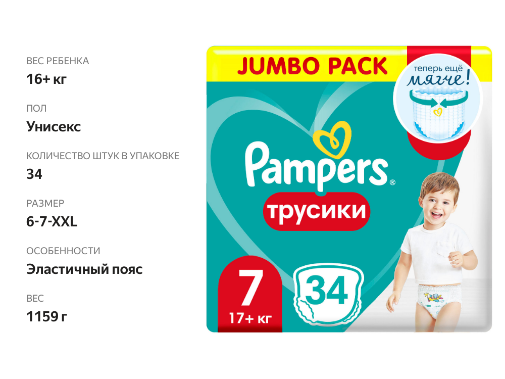 Подгузники трусики Pampers 7 размер, 17+ кг, 34 шт, с мягким пояском