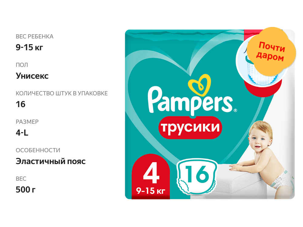 Купить Подгузники-трусики Pampers Pants для малышей 9-15 кг, 4 размер, 16 шт
