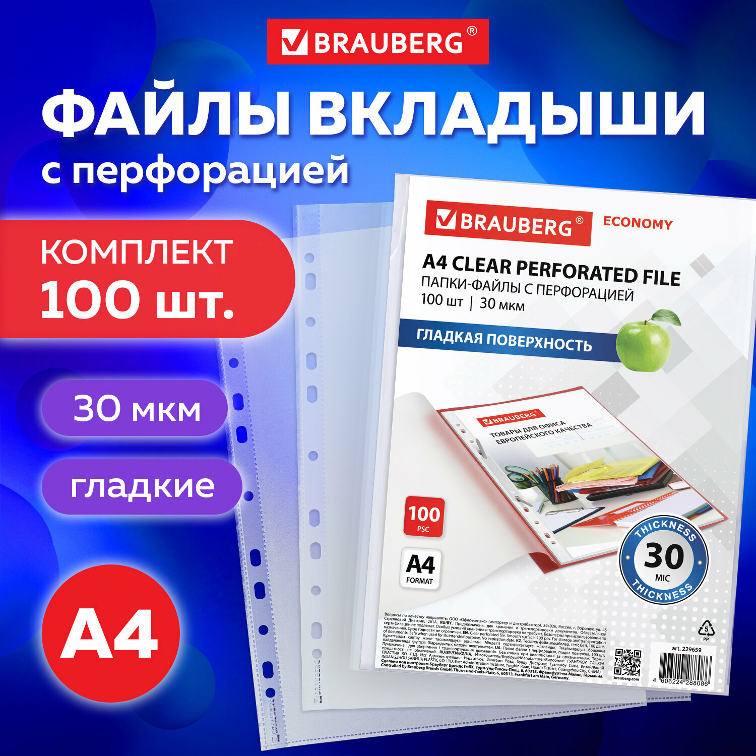 Папки-файлы перфорированные А4 BRAUBERG "ECONOMY", комплект 100 шт., гладкие, 30 мкм, 229659 В наборе: 1компл.