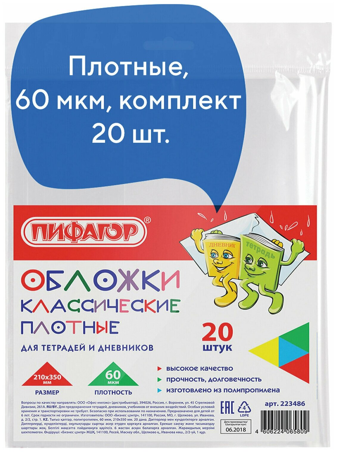Обложки ПП для тетради и дневника пифагор, комплект 20 шт., прозрачные, плотные, 60 мкм, 210х350 мм, 223486, 223486