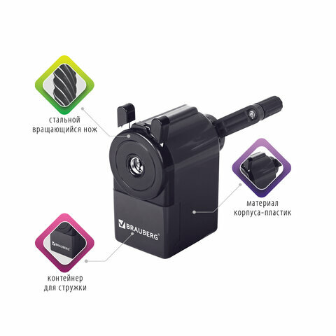 Точилка механическая настольная для карандашей с контейнером для стружки Brauberg Jet, металлический механизм, корпус черный, 229566