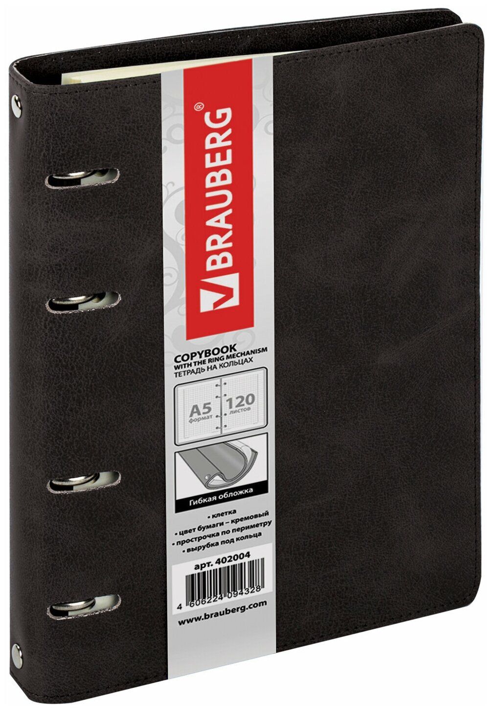 Тетрадь на кольцах, 120 л., BRAUBERG, А5, Main, под гладкую кожу, вырубка под кольца, черная, 402004
