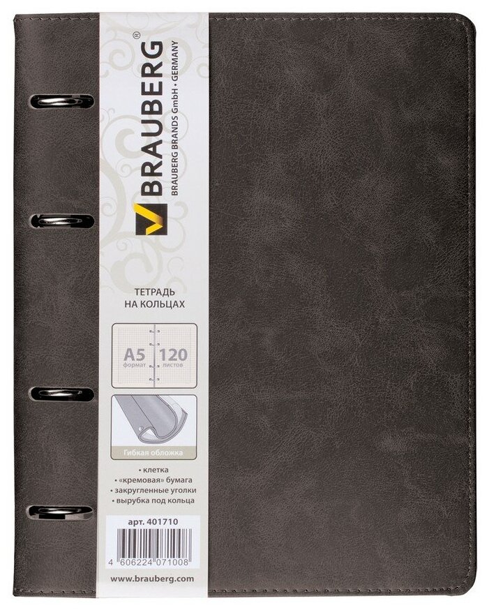 Тетрадь на кольцах А5 (180х220 мм), 120 листов, под кожу, клетка, BRAUBERG "Main", коричневый, 401710 В комплекте: 1шт.
