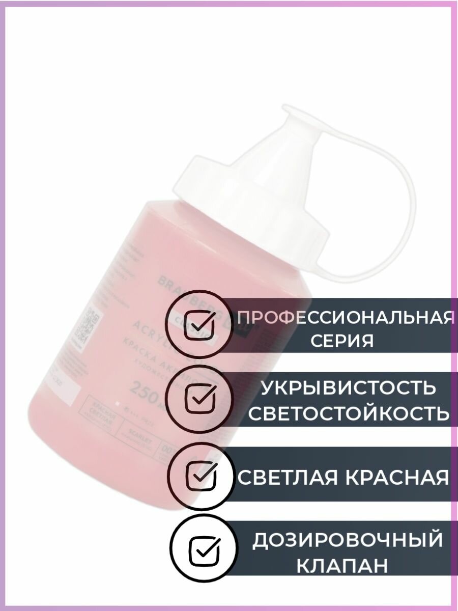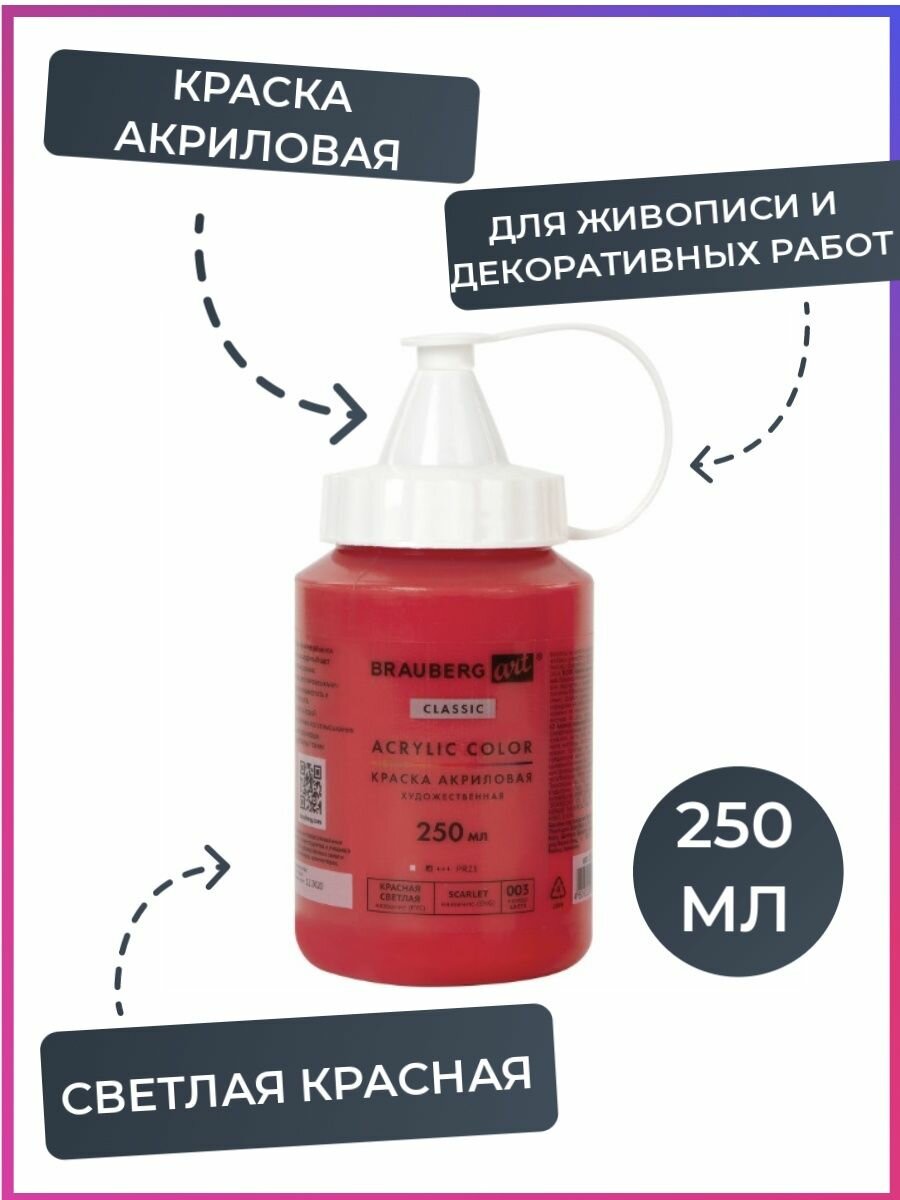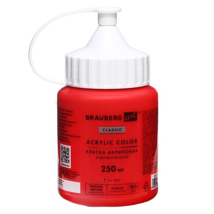 Купить Краска акриловая художественная Brauberg Art Classic, флакон 250 мл, Красная Светлая, 191707