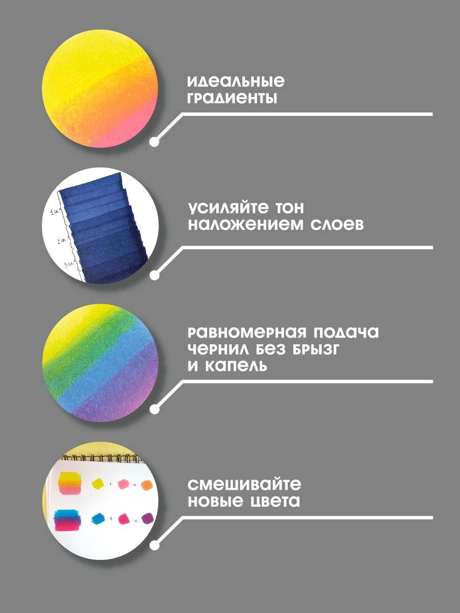 | Отзыв: | В целом маркеры понравились, буду расширять палитру. Корпус тонкий, на любителя, моей руке подходит и в сумке с другими маркерами занимает меньше места. Наконечники позволяют делать красивые акварельные переходы и эффекты. При заливке немного полосят и дают растяжку, но это не столько недостаток сколько особенность. Кисть износостойкая, в сравнении с кистью Copic и Touch более тонкая и мягкая. Своих денег стоит однозначно.
