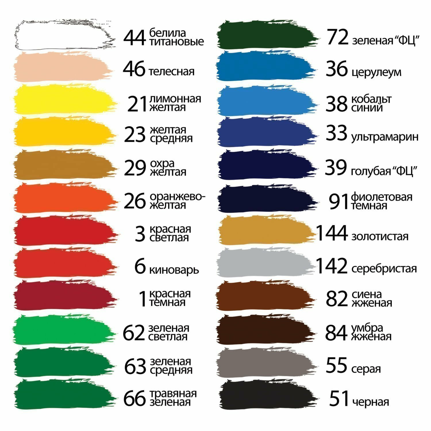 | Подробная комплектация | белила титановые (044), голубой ФЦ (039), желтая средняя (023), зеленый светлый (062), зеленый средний (063), зеленый ФЦ (072), золотистый (144), киноварь (006), кобальт синий (038), красная светлая (003), красная темная (001), лимонная желтая (021), оранжево-желтый (026), охра желтая (029), серебристый (142), серый (055), сиена жженая (082), телесный (046), травяной зеленый (066), ультрамарин (033), умбра жженая (084), фиолетовый темный (091), церулеум (036), черный (051) |