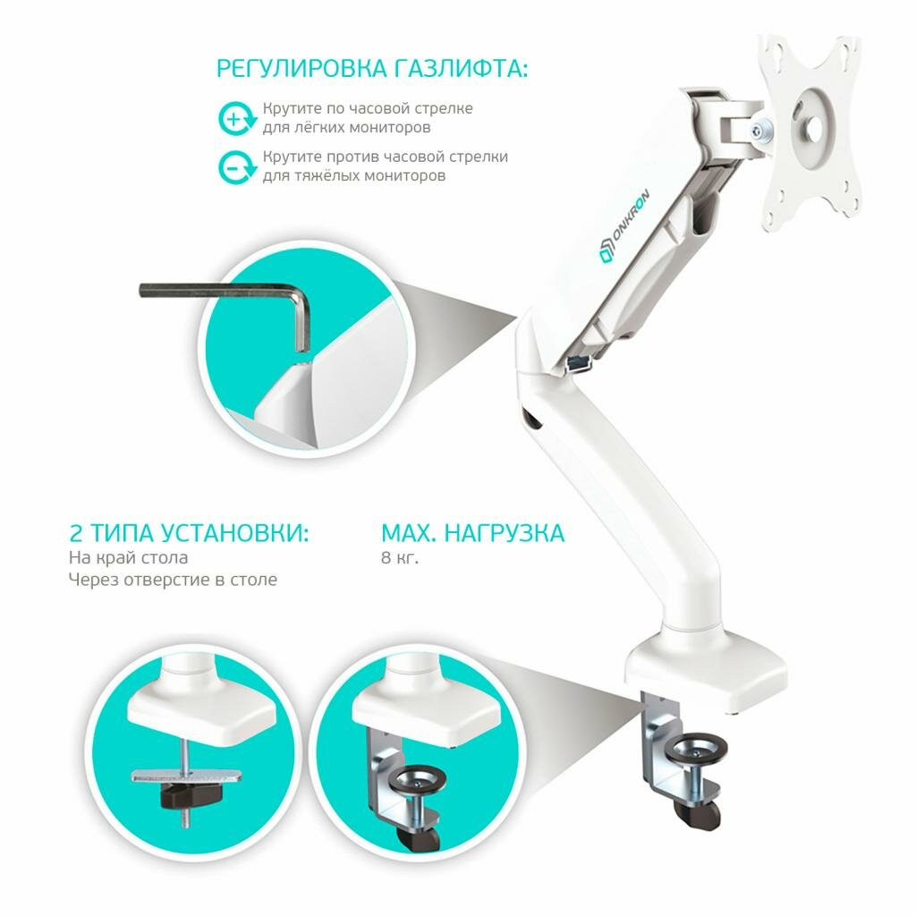 ONKRON настольный кронштейн с системой газлифт для монитора 13"-27", белый G80