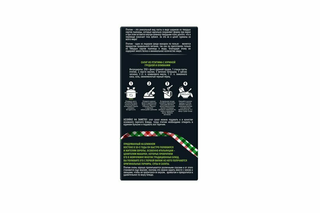 | Дополнительная информация | хранить при температуре не более 35°C и относительной влажности воздуха не более 70%; способ приготовления: в кипящую подсоленную воду засыпать птитим из расчета 1 л воды на каждые 100 г макаронных изделий; аккуратно перемешать ложкой, накрыть крышкой; варить с закрытой крышкой на медленном огне периодически помешивая 8 минут - готовность "аль денте", 12 минут полностью готов; воду слить, использовать готовый птитим для приготовления различных блюд |
