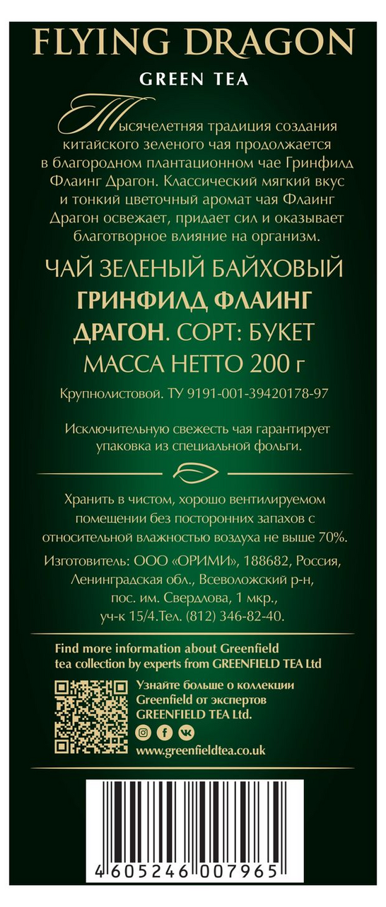 Чай GREENFIELD Flying Dragon зеленый листовой, 200 г