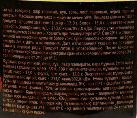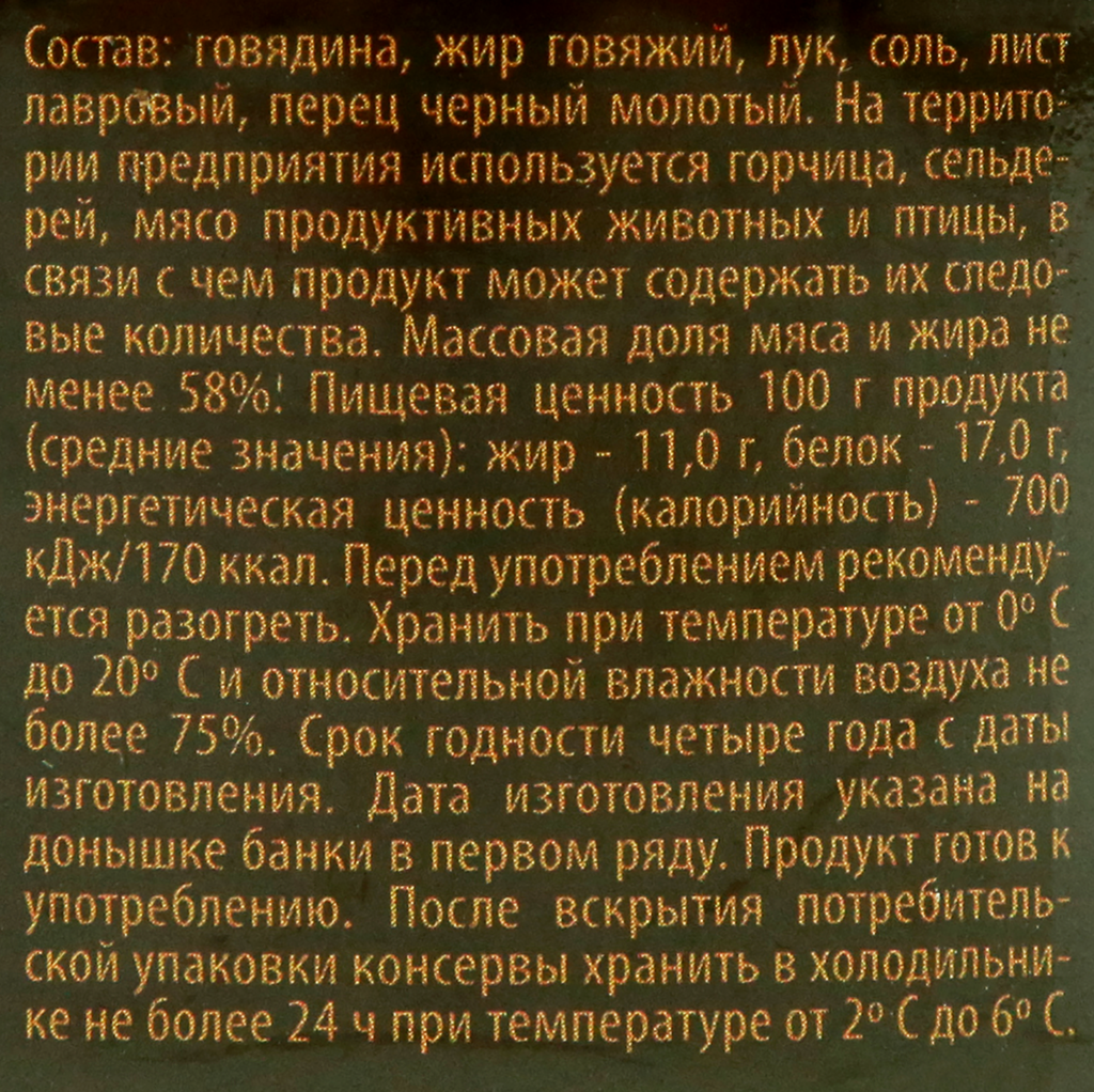 | Состав | говядина, жир говяжий, лук, соль, лист лавровый, перец черный молотый |