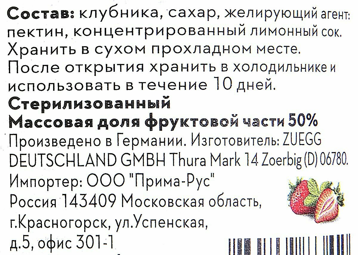 | Состав | клубника, сахар, желеобразователь: пектин, лимонный сок |