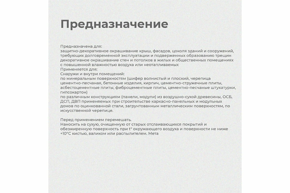| Дополнительная информация | температура применения от +10°С, относительная влажность воздуха менее 70%; Время высыхания (при t° +20±2°C): межслойная сушка на вертикальных поверхностях – 1 час; межслойная сушка на горизонтальных поверхностях – до 2 часов; окончательный набор прочности покрытия - до 7 суток |