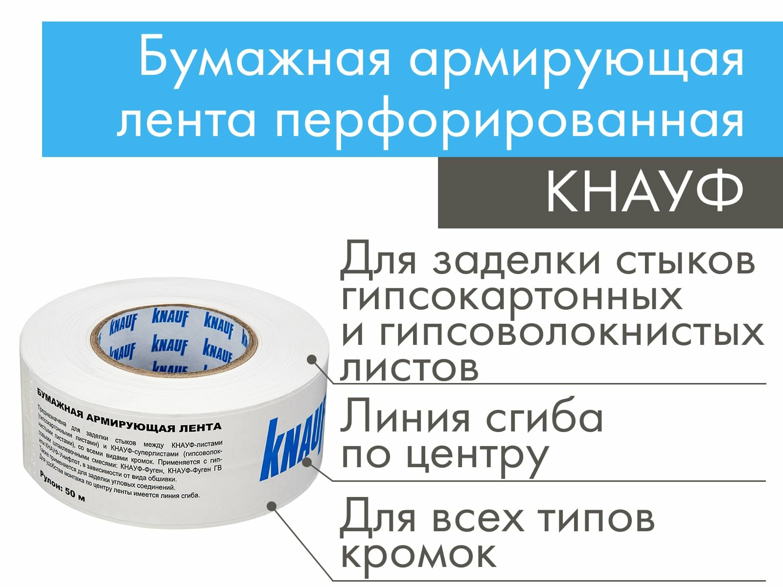 КНАУФ лента бумажная для швов ГКЛ (50м) / KNAUF лента углоформирующая бумажная для швов гипсокартона 52мм (50м)