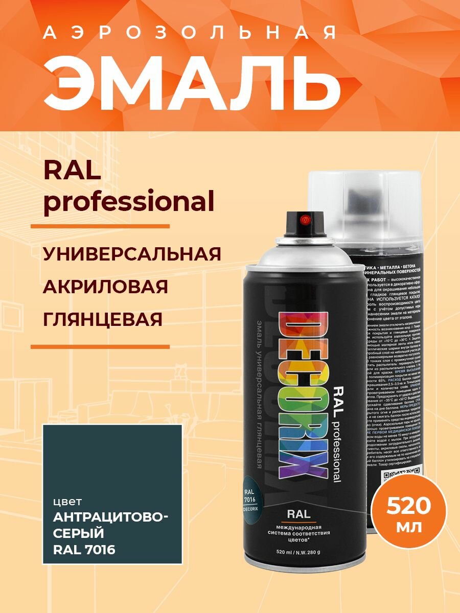 Универсальная высокопрочная эмаль RAL DECORIX 520 мл 400 грамм Цвет RAL: RAL 7016 Антрацитово-серый