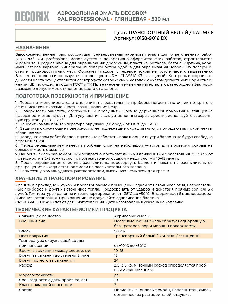 Decorix Аэрозольная эмаль RAL Professional глянцевая транспортный белый RAL 9016 520 мл 0138-9016 DX .