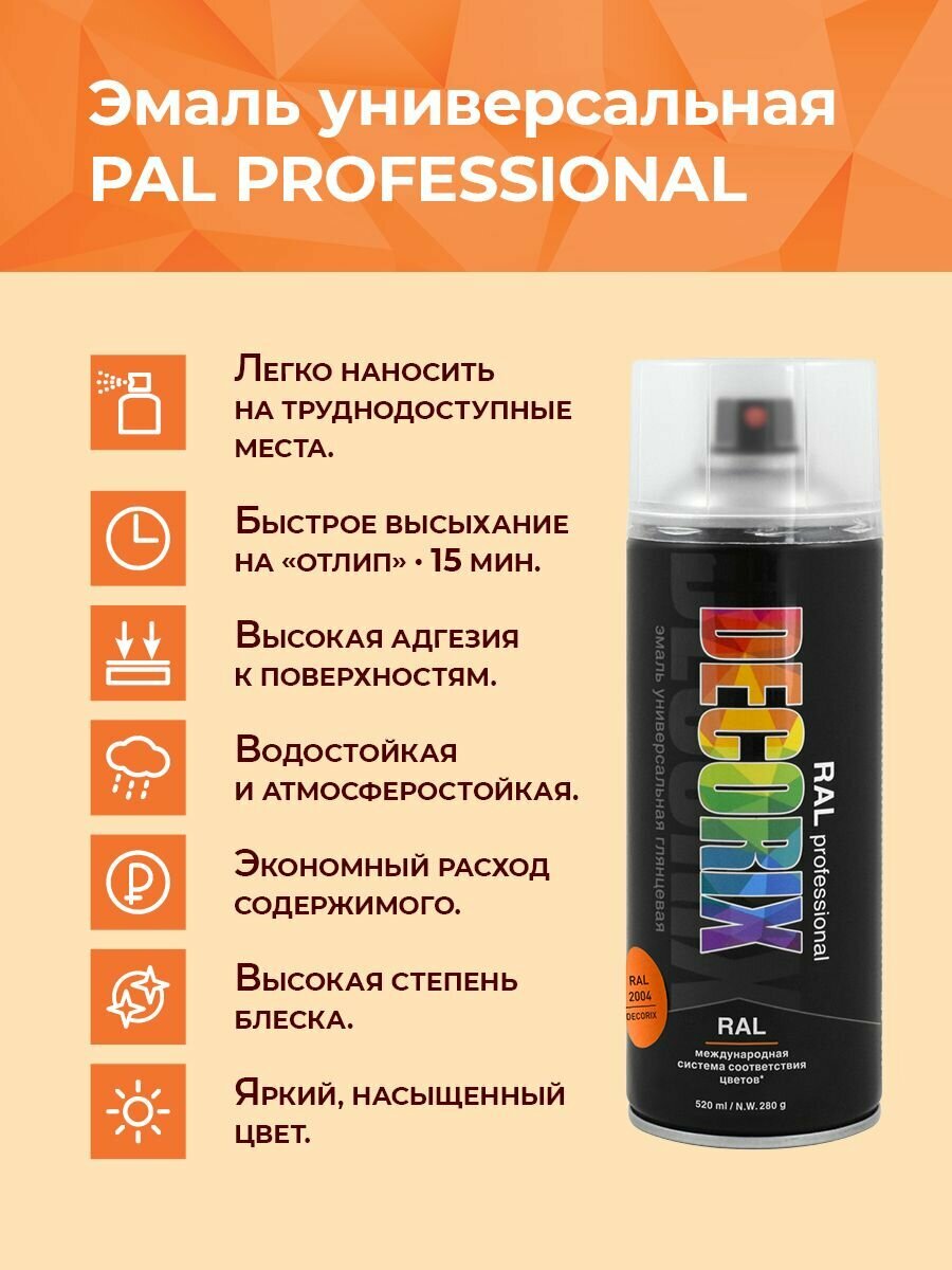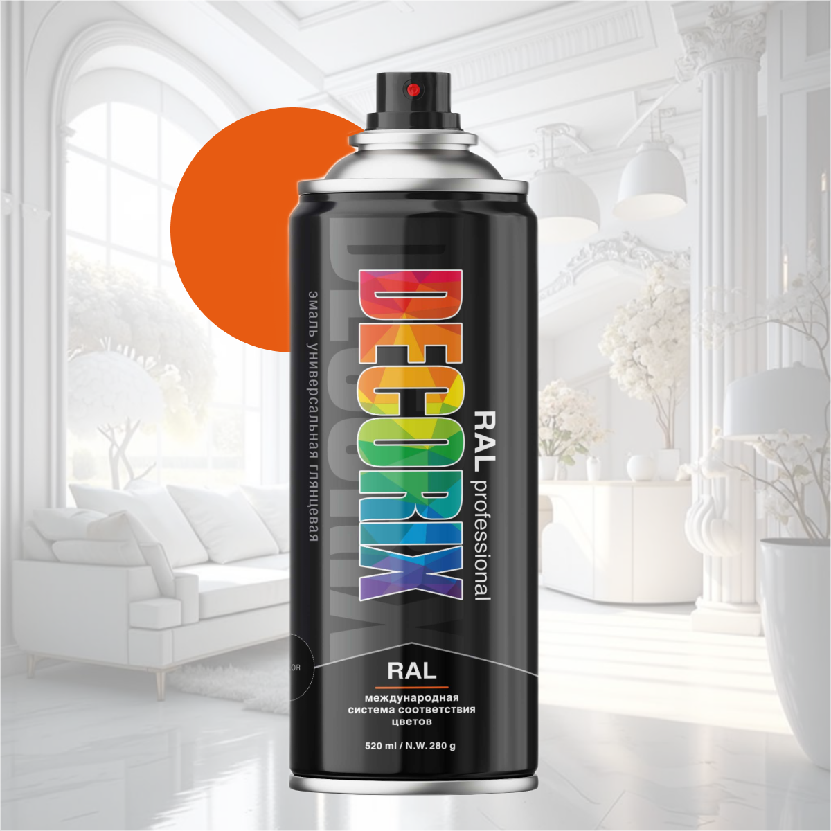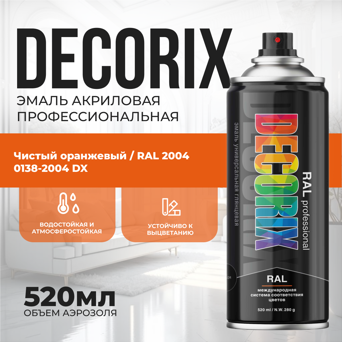 Универсальная высокопрочная эмаль RAL DECORIX 520 мл 400 грамм Цвет RAL: RAL 2004 Чистый оранжевый