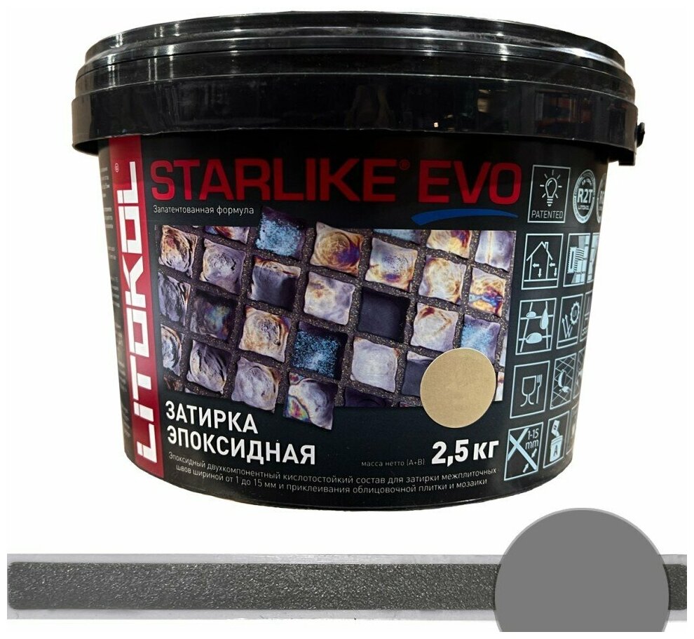 СохранитьЗатирка для плитки двухкомпонентная на эпоксидной основе Litokol Starlike EVO (2,5кг) S.120 grigio piombo интересное: