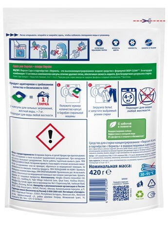 | Способ применения | 1 капсула для 4-5 кг белья и воды любой жесткости. 3 капсулы для сильных загрязнений, жесткой воды, > 7 кг белья. Положите капсулу в барабан стиральной машины, загрузите белье, начните стиркку. |