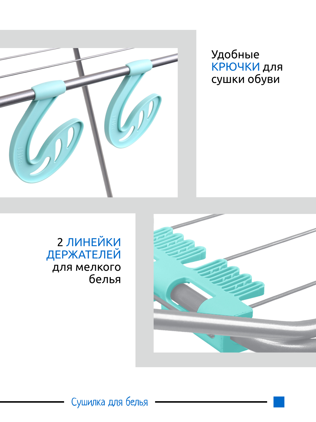 С одной стороны у ножек даже есть колёсики. Удобные крюки для сушки обуви и маленькие крючки для нижнего белья. Классная съемная секция которую можно переместить на батарею если сушилка не помещается в длину или нужно просто быстрее высушить на горячей батарее какие-то вещи. |