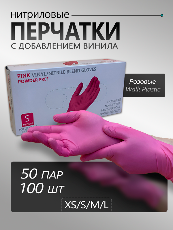 Перчатки одноразовые Wally Plastic, размер L, 100 шт, 50 пар розовые, нитриловые/виниловые хозяйственные, садовые, мытья посуды, уборки, для готовки, косметические, для сада и огорода, шугаринга, резиновые, латексные, нейлоновые