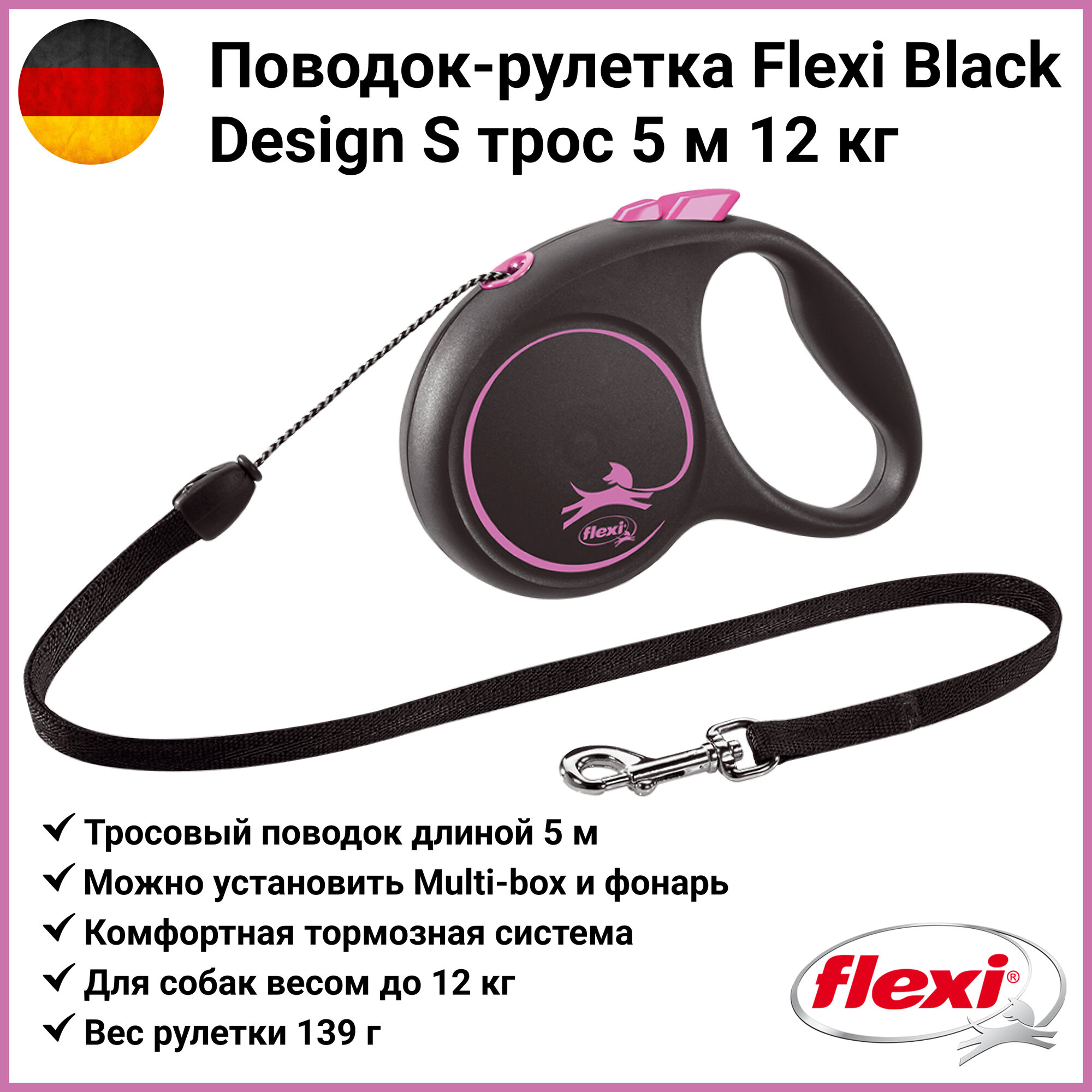 Рулетка Black Design S (до 12 кг) 5 м трос черный/розовый flexi VLT-98033319