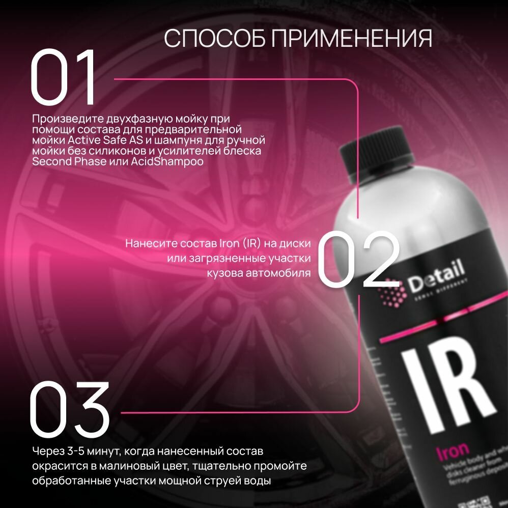 | Способ применения | 1) помойте автомобиль при помощи Active Safe (AS); 2) нанесите состав Iron(IR) на загрязнённые участки; 3) через 2-3 минуты, когда нанесенный состав окрасится в малиновый цвет, тщательно промойте обработанные участки мощной струей воды, для очистки тяжелых загрязнений колесных дисков рекомендуется выдержать состав на поверхности в течение 3 минут, затем удалите загрязнение при помощи мягкой щётки или кисточки |