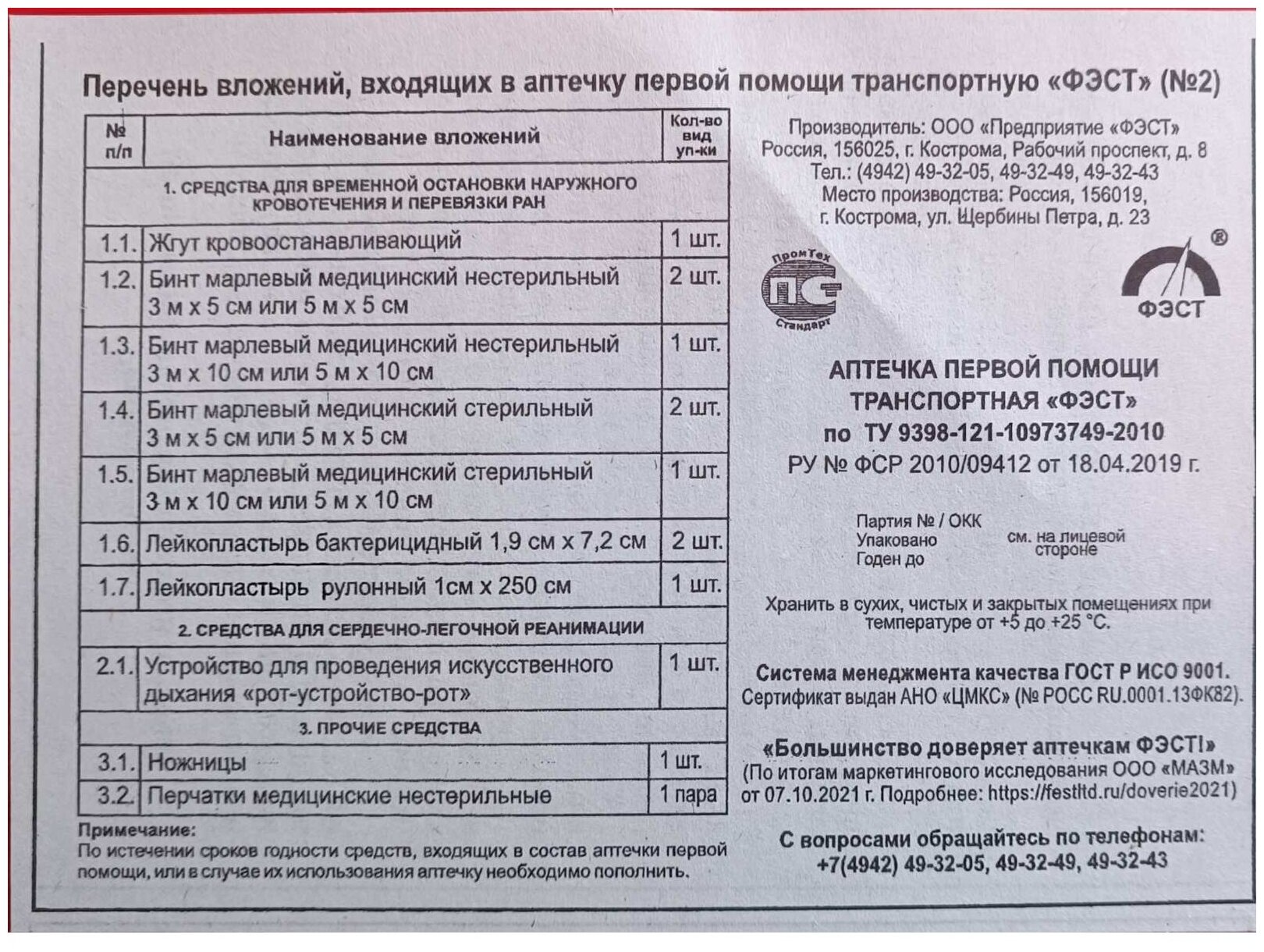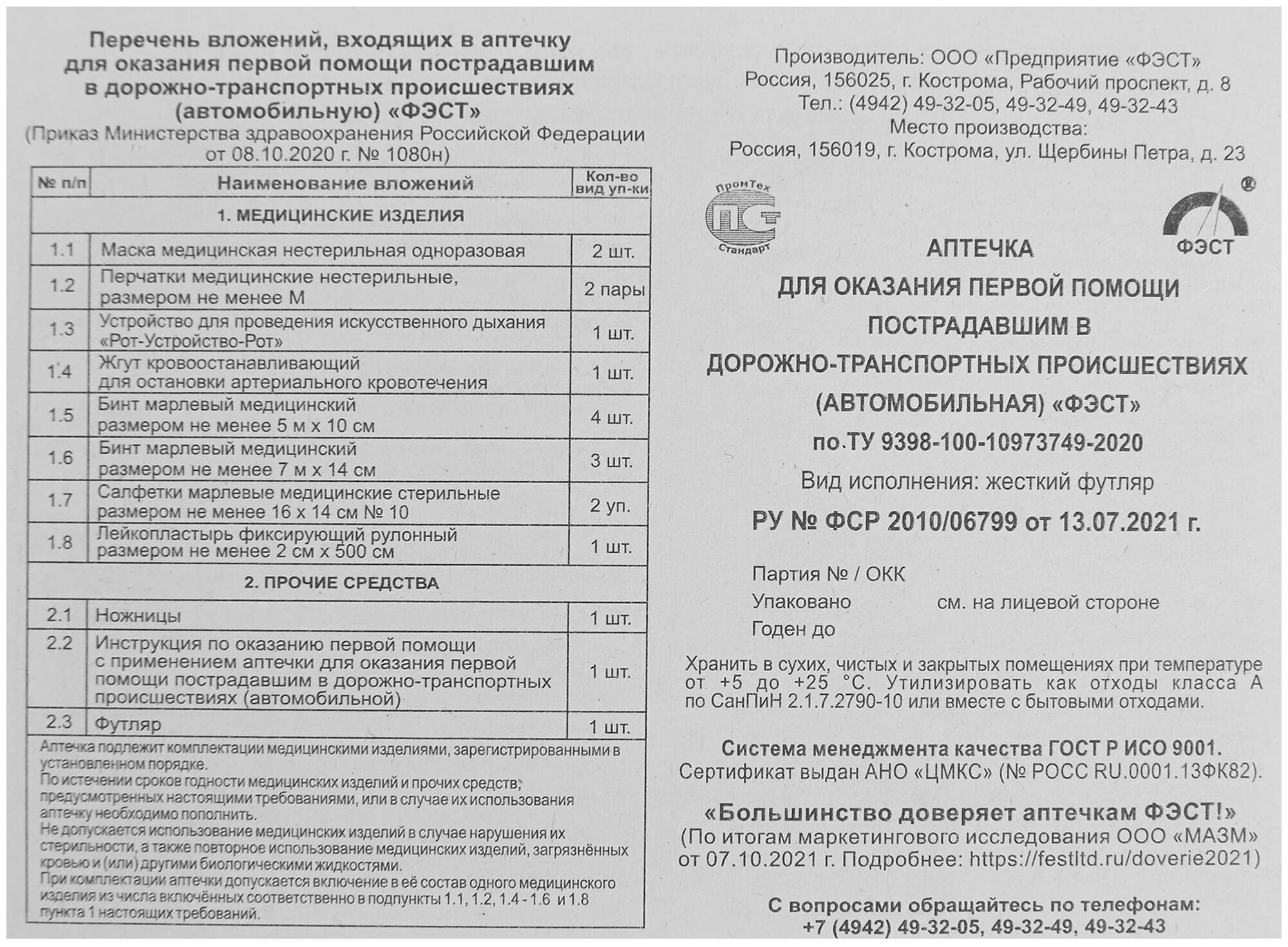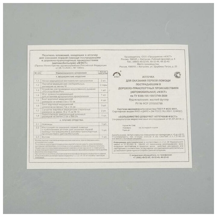 Фэст, автомобильная аптечка первой помощи (приказ 1080н)