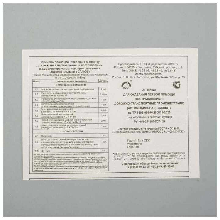 Аптечка автомобильная ФЭСТ футляр из полистирола, новый состав по приказу № 1080Н от 08.10.20