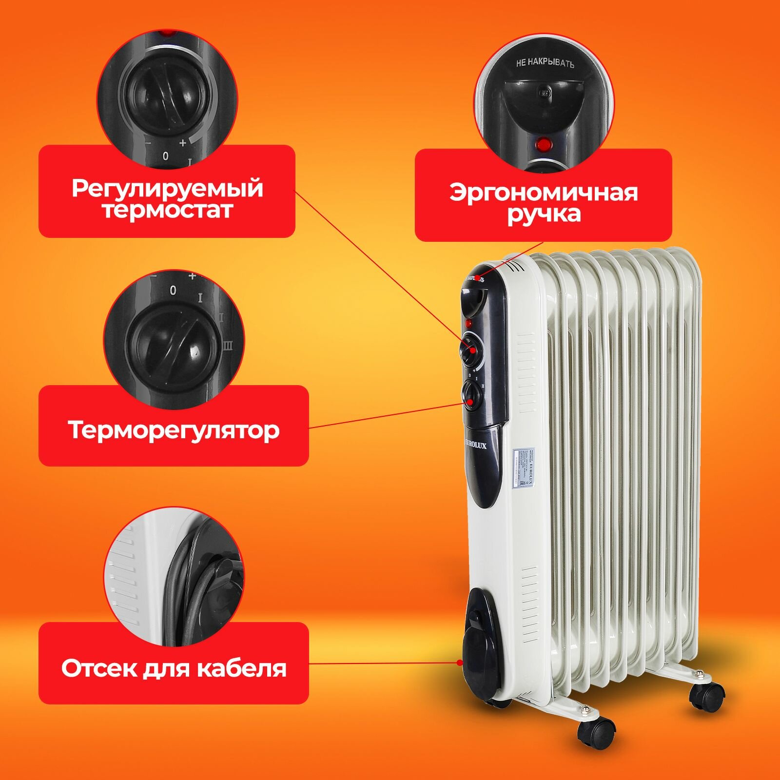 Масляный радиатор Eurolux ОМПТ-EU-7Н, 1.5 кВт, 20 м², колеса в комплекте, белый/черный