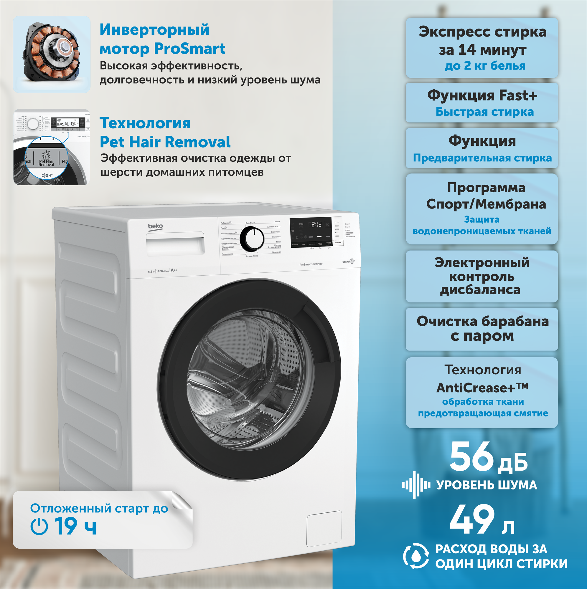 Стиральная машина Beko WSRE6H612ZAWI класс: A-10% загр.фронтальная макс.:6.5кг белый