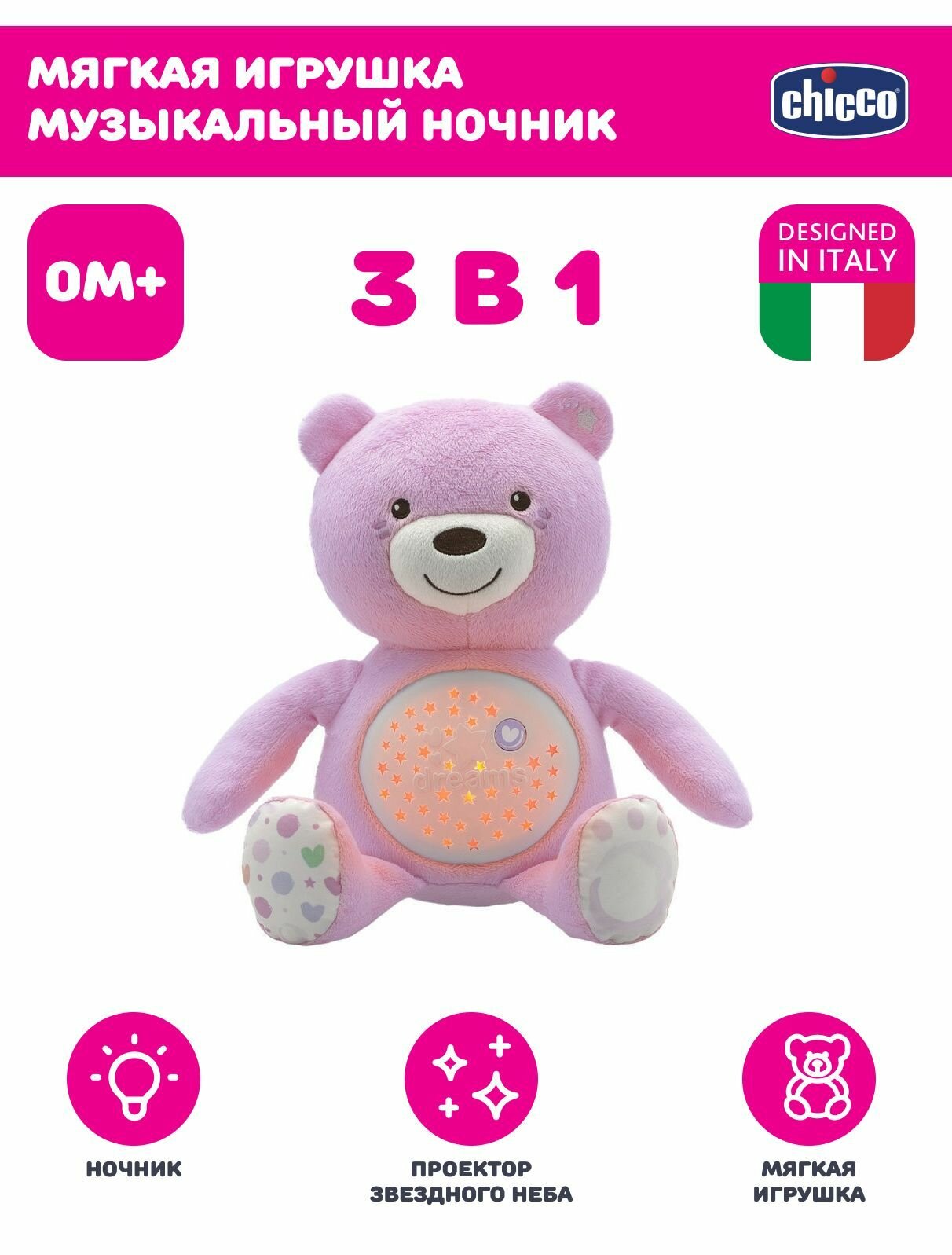 Игрушка мягкая с ночником проектором Chicco Мишка музыкальный розовый, подарок для новорожденного
