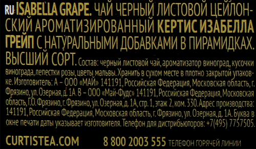 | Состав | цейлонский черный байховый чай, ароматизатор виноград идентичный натуральному, кусочки винограда, лепестки розы, цветы мальвы |