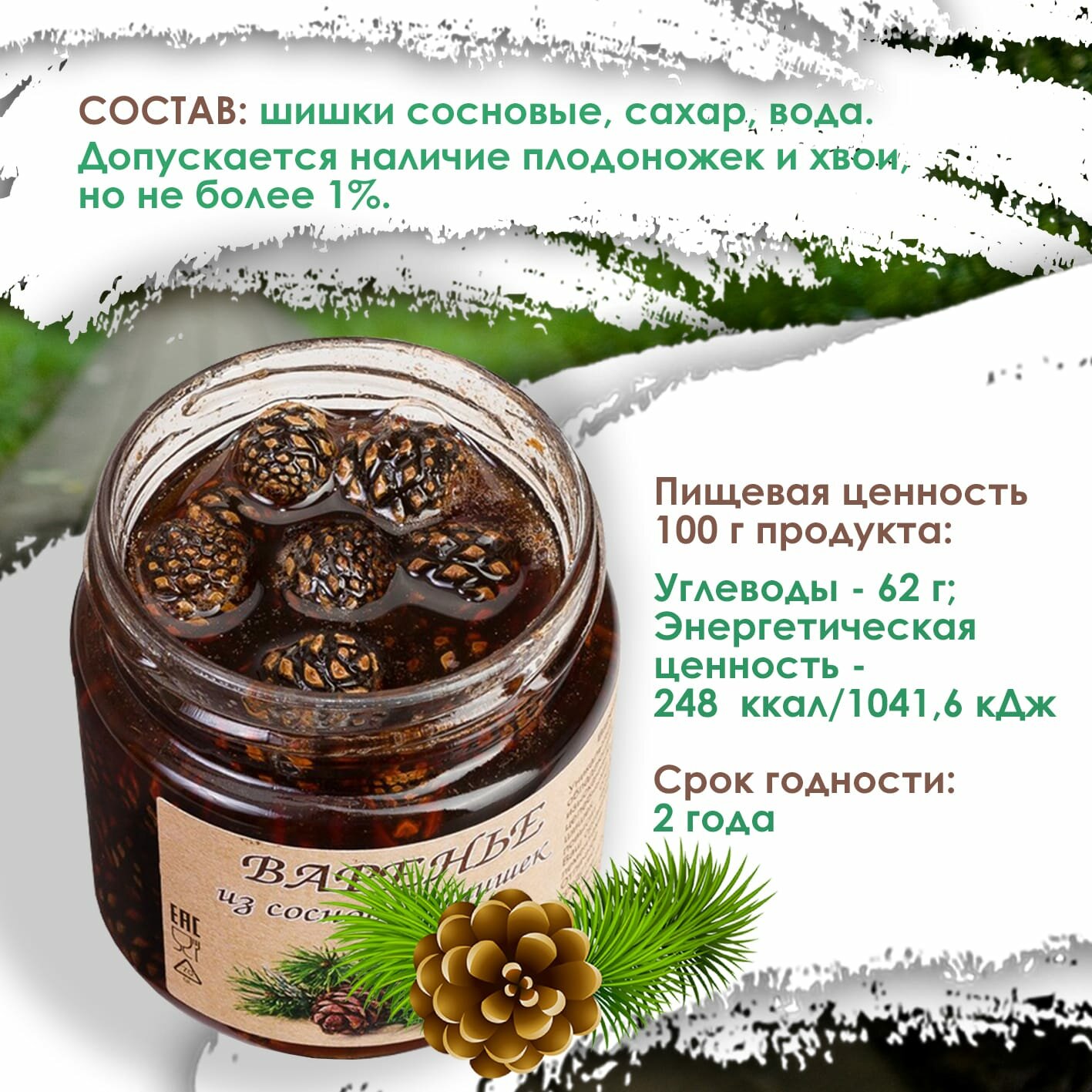 | Состав | шишки сосновые, сахар, вода |