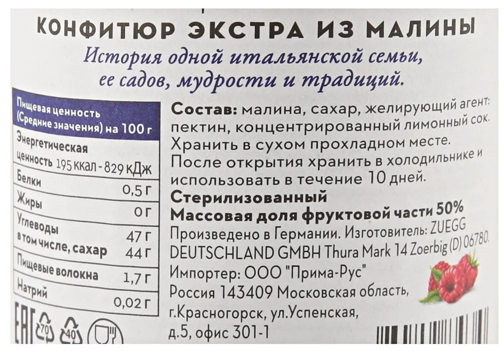 | Состав | малина, сахар, желирующий агент: пектин, концентрированный лимонный сок |