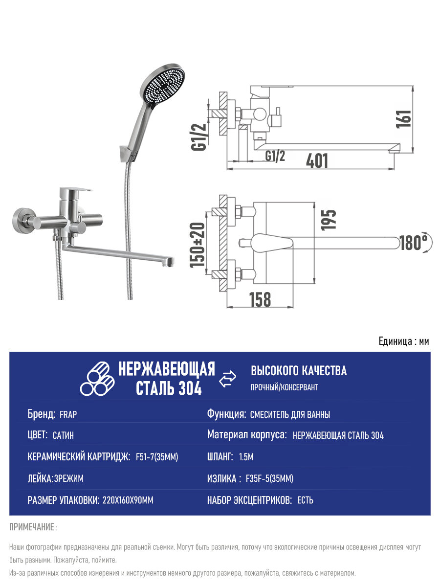 Смеситель для ванны Frap F2248 из нержавеющей стали с лейкой
