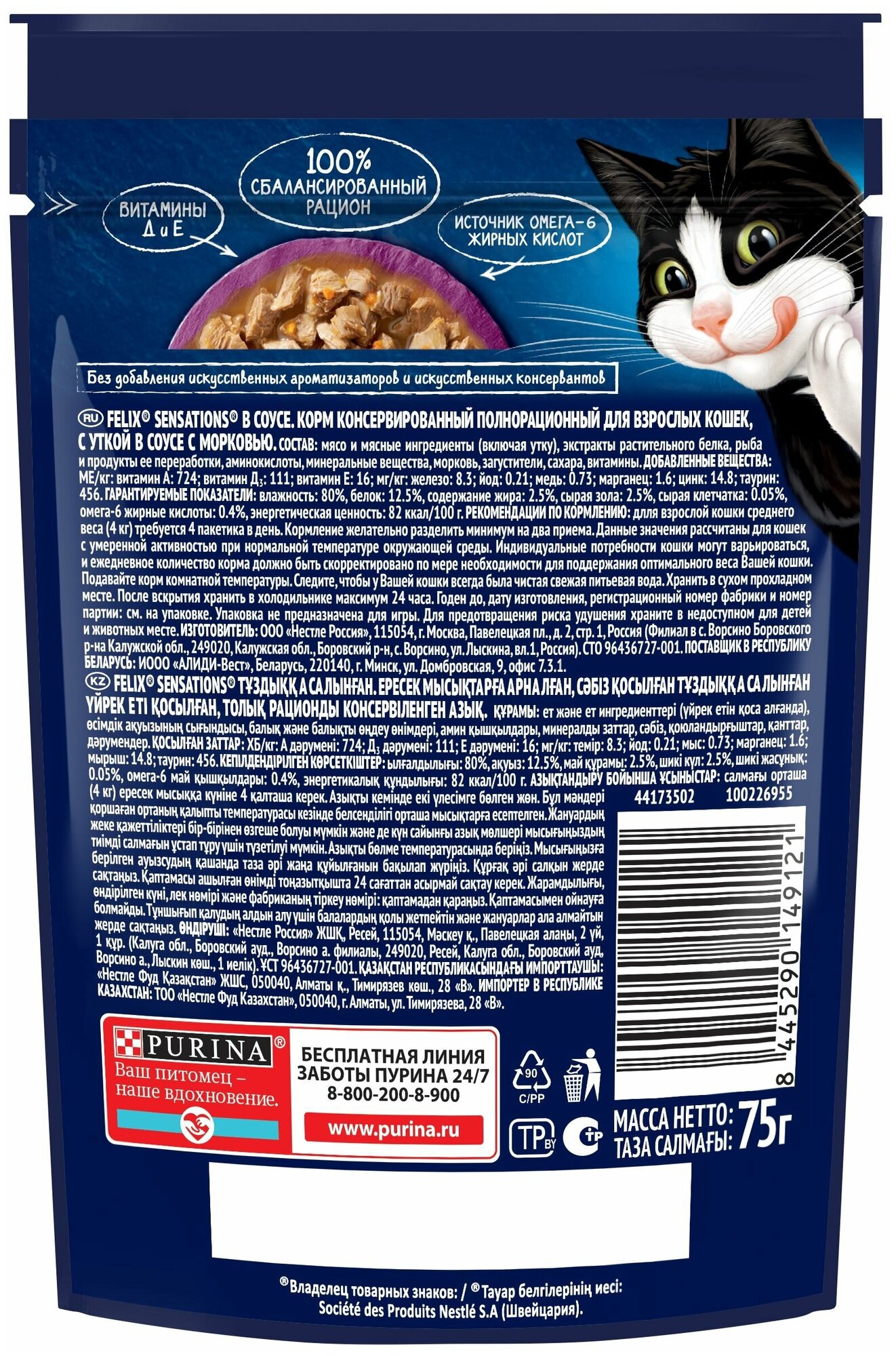 Влажный корм для взрослых кошек Felix Sensations, с уткой, с морковью 75 г (кусочки в соусе)