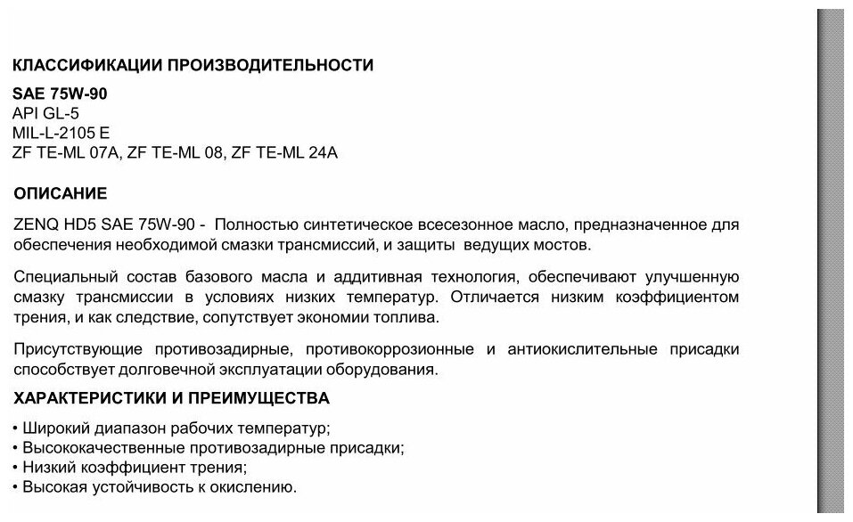 ZENQ HD5 75w90 GL-5 (100% синт) 1л интересное: