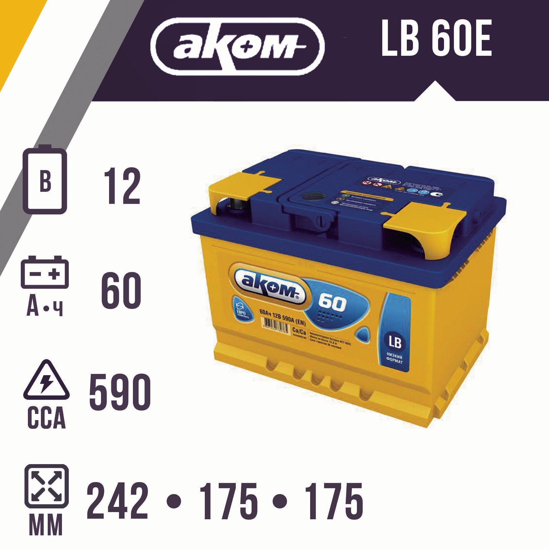 Купить Аккумулятор автомобильный АКОМ LB (Akom) 60 А/ч 590 А обр. пол. низкий Евро авто (245х175х175)
