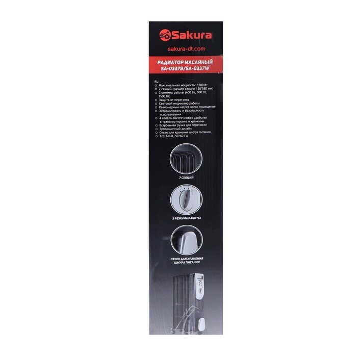 SAKURA Обогреватель Sakura SA-0337B, масляный, напольный, 1500 Вт, 20 м2, 7 секций, чёрный
