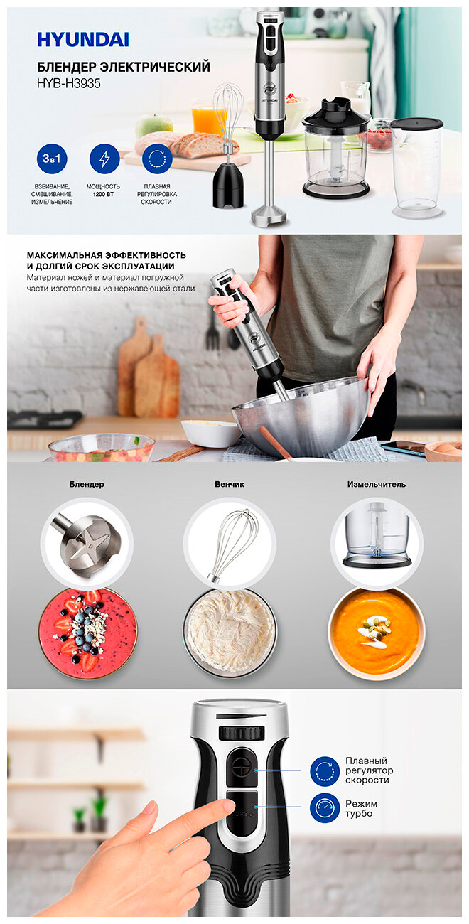 Блендер погружной Hyundai HYB-H3935, 1200 Вт, 2 скорости интересное: