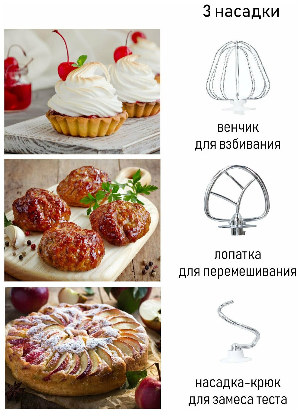 | Насадки | крючки для замешивания теста / венчик для взбивания / лопатка |