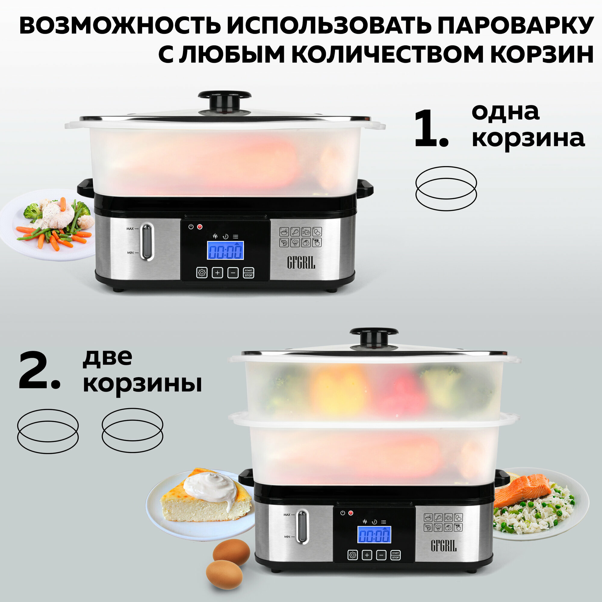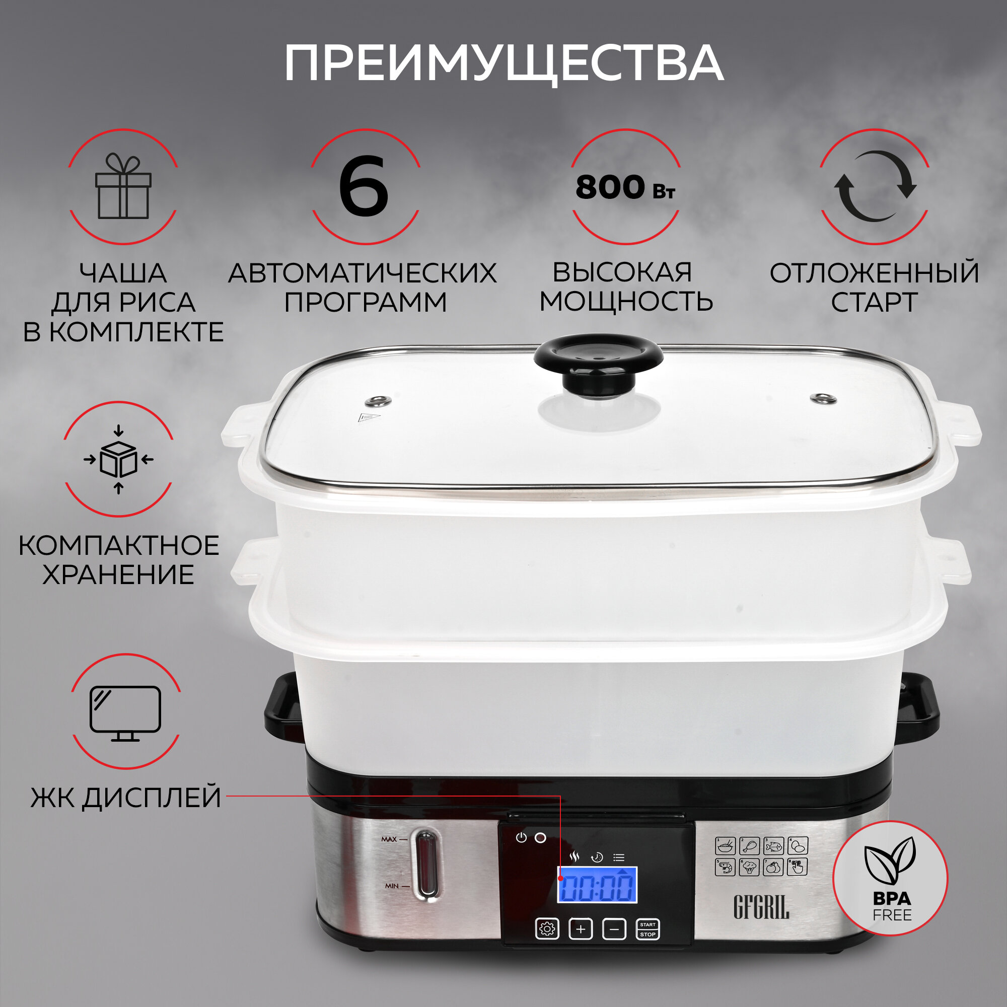 GFGRIL пароварка GFS-9D, 8 программ, цифровое управление, ударопрочные чаши, электрическая пароварка объемом 12л, формы для омлета и маффинов интересное: