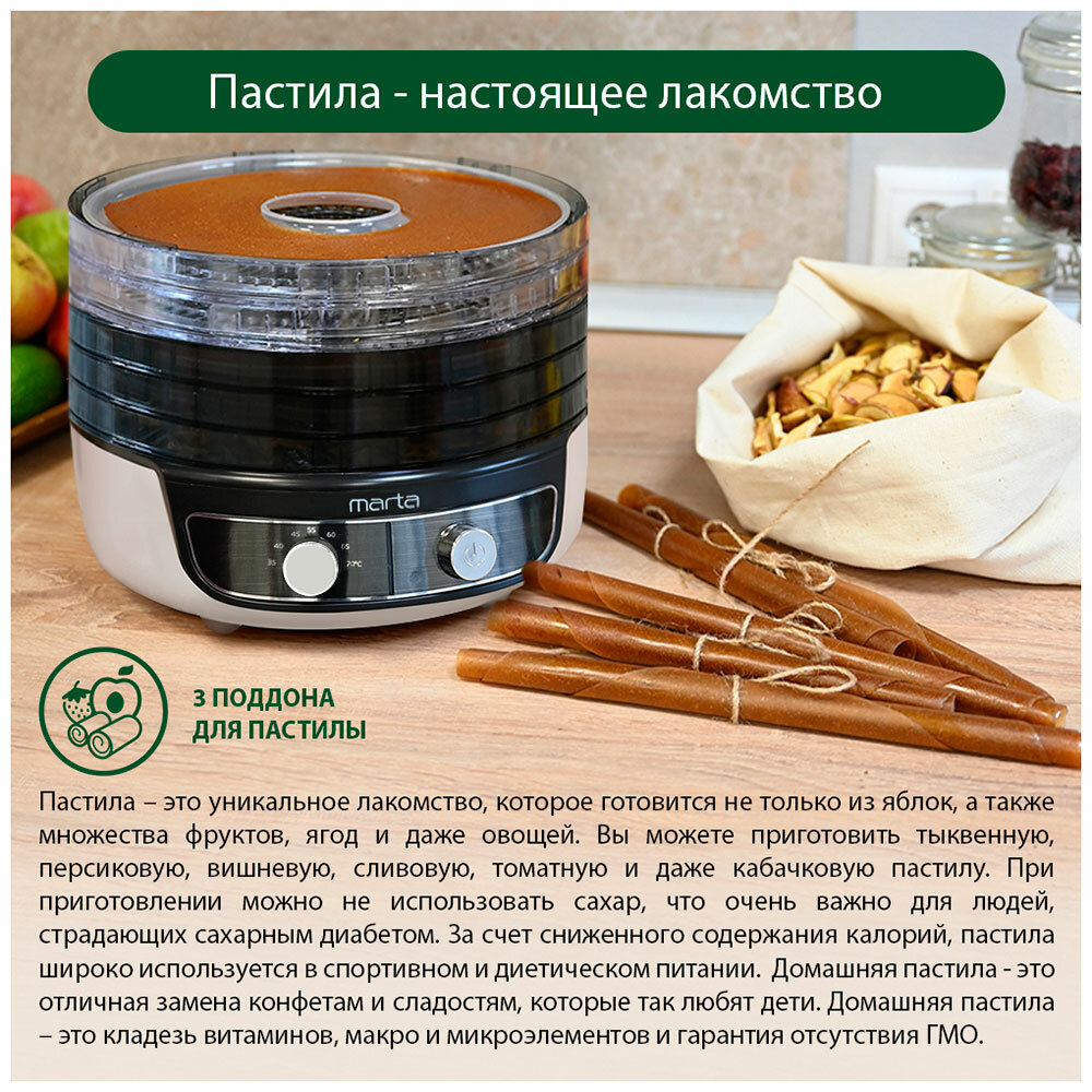 MARTA MFD-8053PS 8 поддонов-5(2 разбор) +3 для пастилы темный обсидиан сушилка д/фруктов,овощей