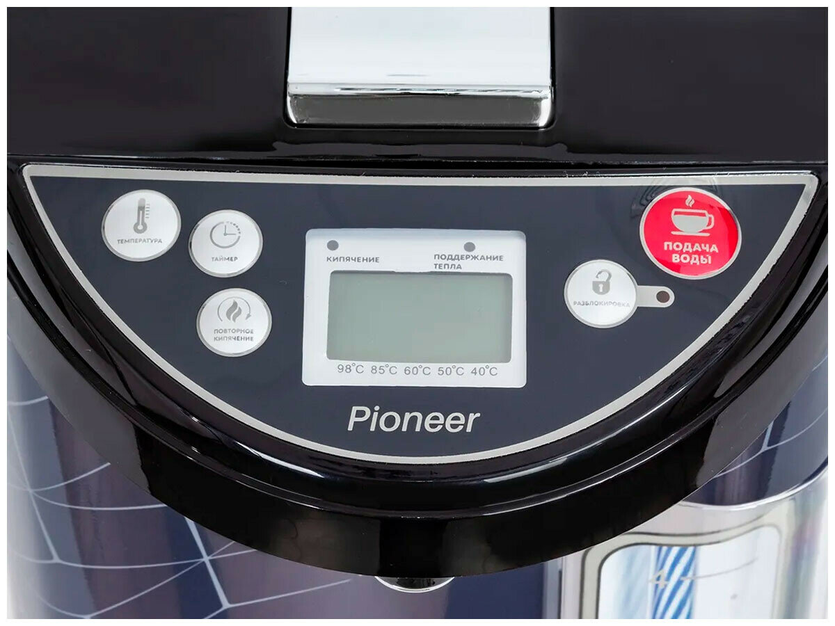 Термопот Pioneer 5 литров, с функцией выбора температуры нагрева 40, 50, 60, 85, 98 градусов, 3 способа подачи воды, индикатор уровня воды, сенсорное управление